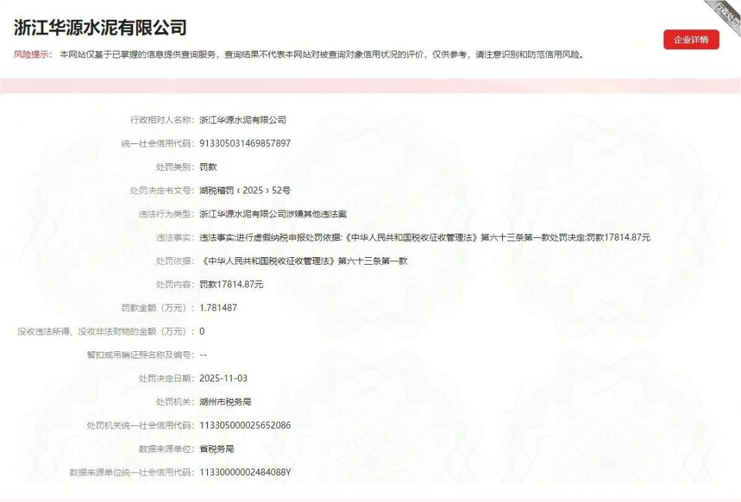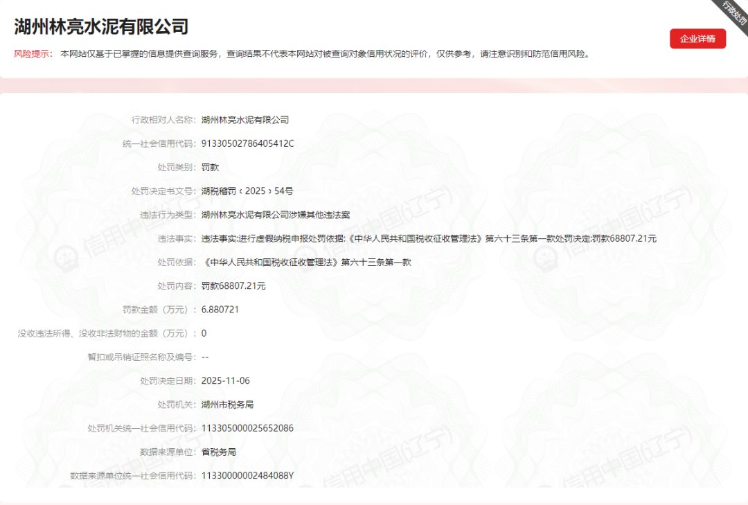 湖州林亮水泥有限公司(统一社会信用代码:91330502786405412C)也因相同性质的税收违法行为,被湖州市税务局依据同一法律条款处以罚款68,807.21元(文号:湖税稽罚(2025)54号)。