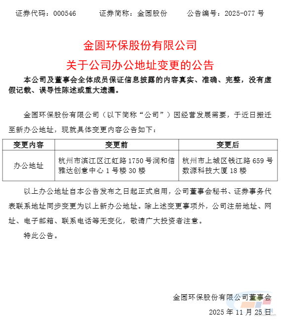 行业视野 金圆股份:公司办公地址变更 金峰建材 2026-04-19 2026-04-19 11月25日,金圆股份发布公告,公司因经营发展需要,办公地址由杭州市滨江区江虹路1750号润和信雅达创意中心1号楼30楼变更至杭州市上城区钱江路659号数源科技大厦18楼。 分享本文: 本文链接:https://www.jfxiyou.com/hangyeshiye/3847.html