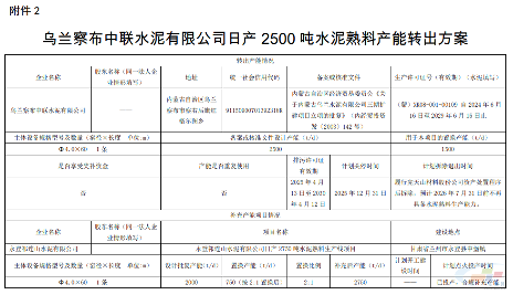 11月21日,内蒙古工信厅发布《关于乌兰察布中联水泥日产5000吨熟料生产线补充产能置换方案和日产2500吨水泥熟料产能转出方案的公示》。