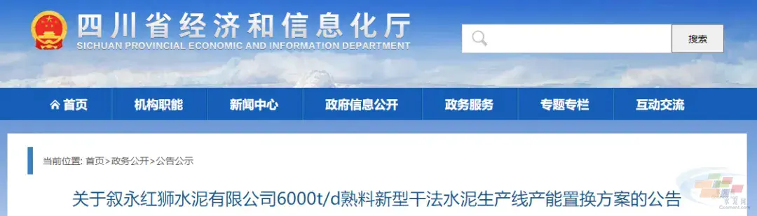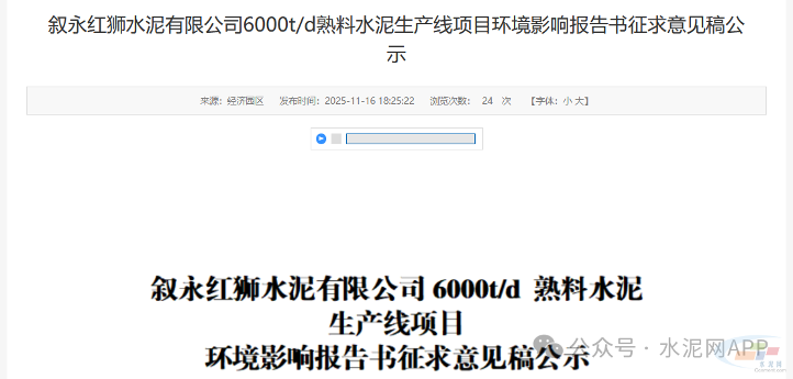 11月16日,四川省泸州市叙永县发布“叙永红狮水泥有限公司6000t/d熟料水泥生产线项目环境影响报告书征求意见稿公示”。
