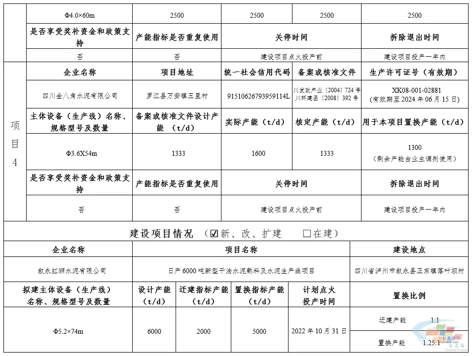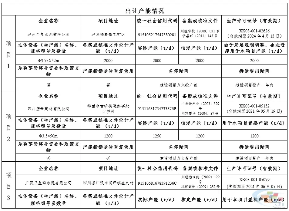 据了解,2021年,四川省经济和信息化厅发布公告,叙永红狮水泥有限公司拟通过退出泸州兰良水泥有限公司2000t/d、四川宏云建材有限公司1200t/d、广汉三星堆水泥有限公司2500t/d、四川金八角水泥有限公司1300t/d等四个项目在四川省泸州市叙永县正东镇落叶坝村建设日产6000吨新型干法水泥熟料及水泥生产线项目。