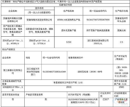浙江新都水泥有限公司2500t/d熟料线产能指标将置换补充到安徽池州海螺水泥股份有限公司4500t/d熟料线,置换比例2:1,补充之后,安徽池州海螺水泥股份有限公司4500t/d熟料线产能将变更为5750t/d。