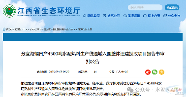9月9日,江西省生态环境厅发布“分宜海螺日产4500t/d水泥熟料生产线退城入园整体迁建技改项目报告书审批公告”称,根据建设项目环境影响评价审批程序相关规定,经审查,我厅拟对受理分宜海螺日产4500吨水泥熟料生产线退城入园整体迁建技改项目做出批复决定。