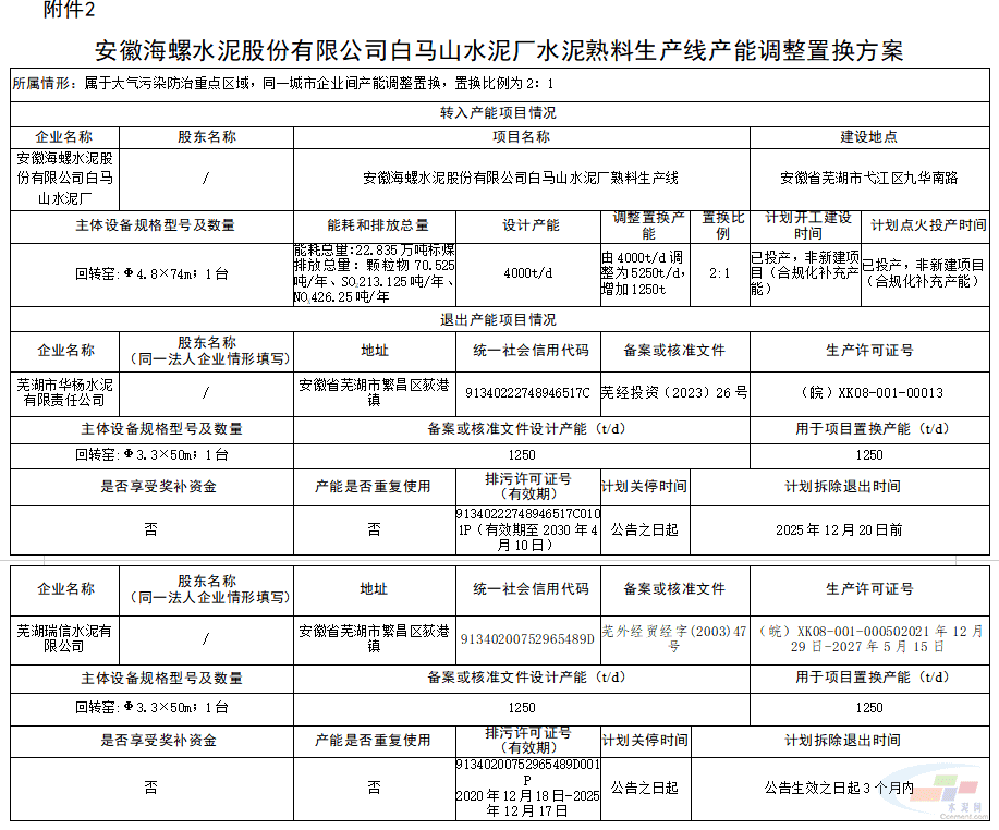 芜湖南方、安徽海螺白马山水泥厂水泥熟料生产线产能调整置换方案公示