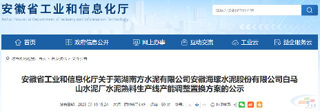 近日,安徽省工业和信息化厅发布了关于芜湖南方水泥有限公司安徽海螺水泥股份有限公司白马山水泥厂水泥熟料生产线产能调整置换方案的公示。