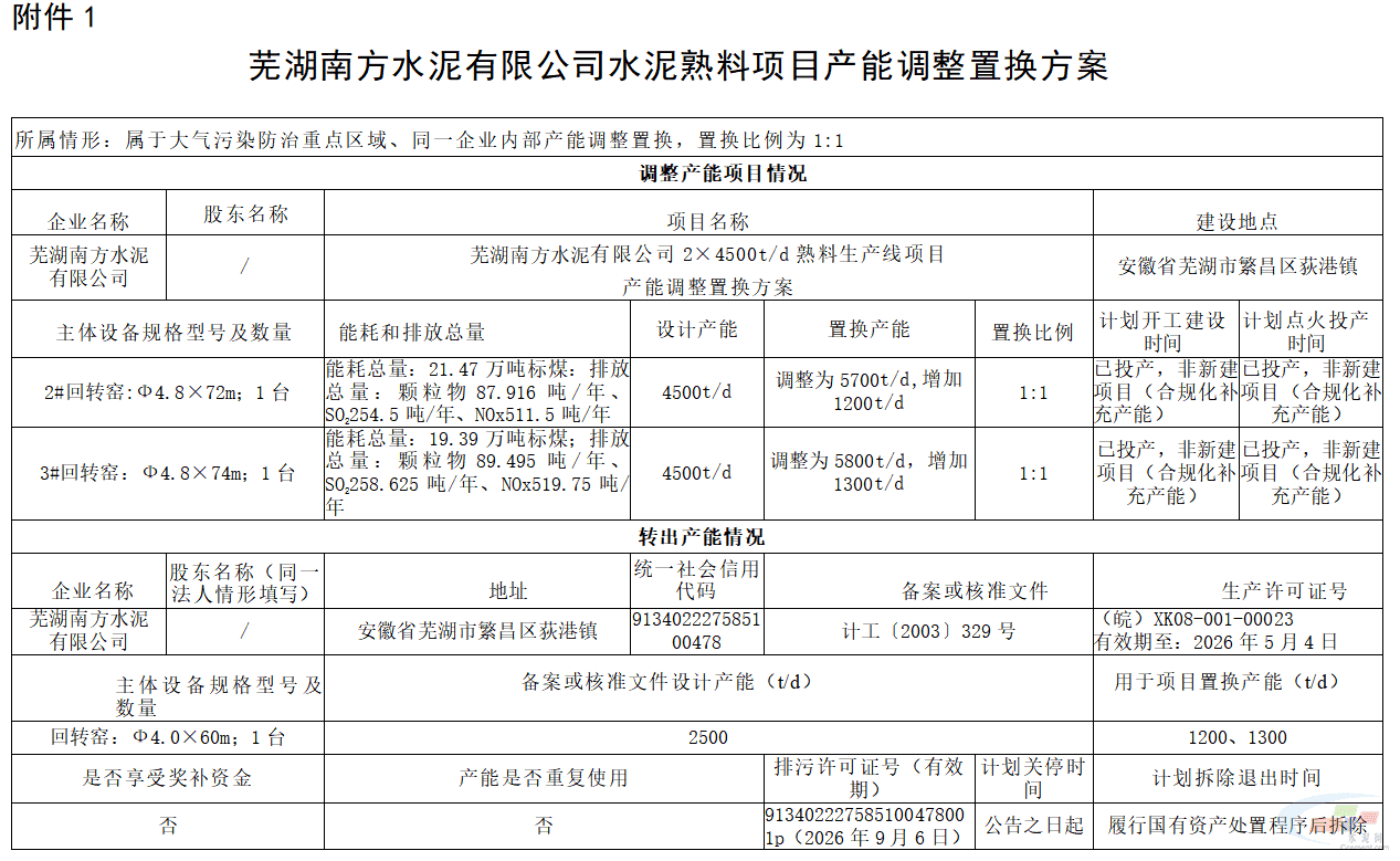 附件:1.芜湖南方水泥有限公司水泥熟料项目产能调整置换方案