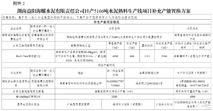 11月3日,湖南省工业和信息化厅发布《关于临湘海螺水泥有限责任公司、湖南益阳海螺水泥有限责任公司补充产能置换方案的公示》,益阳海螺4500t/d水泥熟料生产线补充666t/d产能,置换比例1.5:1,产能指标来源为湖南省云峰水泥有限公司2500t/d线。